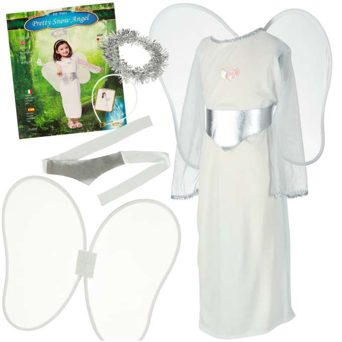 Angyal jelmez kiegészítőkkel gyerekeknek. A készlet tartalmaz egy hosszú fehér ruhát, szárnyakat, egy övet és egy glóriás fejpántot. Tökéletes karneváli bálokhoz, Halloween-hez és tematikus bulikhoz. 100-110 centiméter magas gyerekeknek.