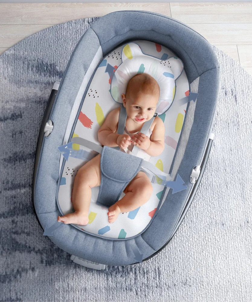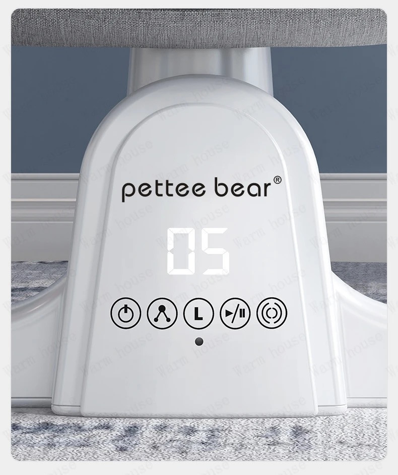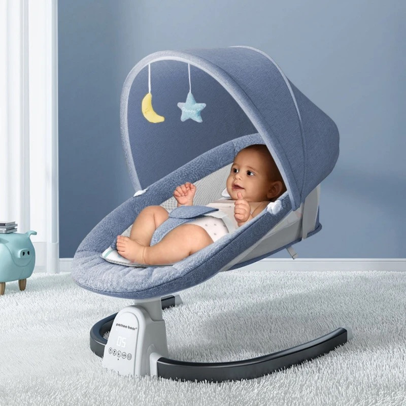 - Állítható ringatási fokozat, távirányítóval szabályozható időtartam, zenélő funkció, hangeffektek