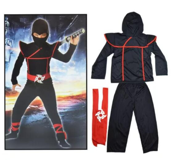 Csomag tartalma: felső rész kapucnis maszkkal, nadrág, öv, két piros szalag a lábakhoz