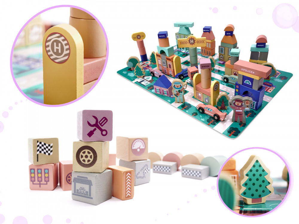 A kockák részletekkel gyönyörködnek, a színes állatok, járművek és épületek minden gyermek figyelmét felkeltik.