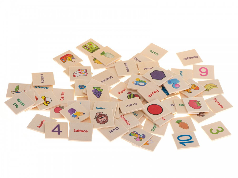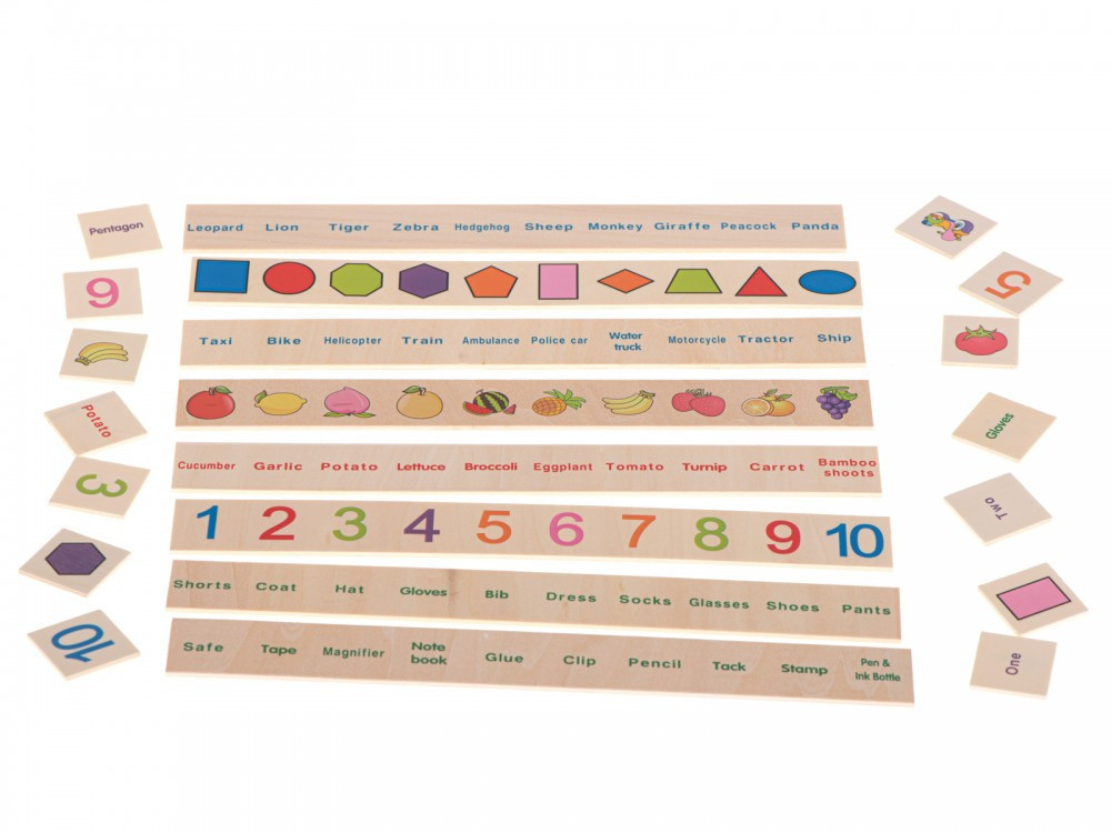A táblákon számok, állatok és tárgyak angol nevei szerepelnek .